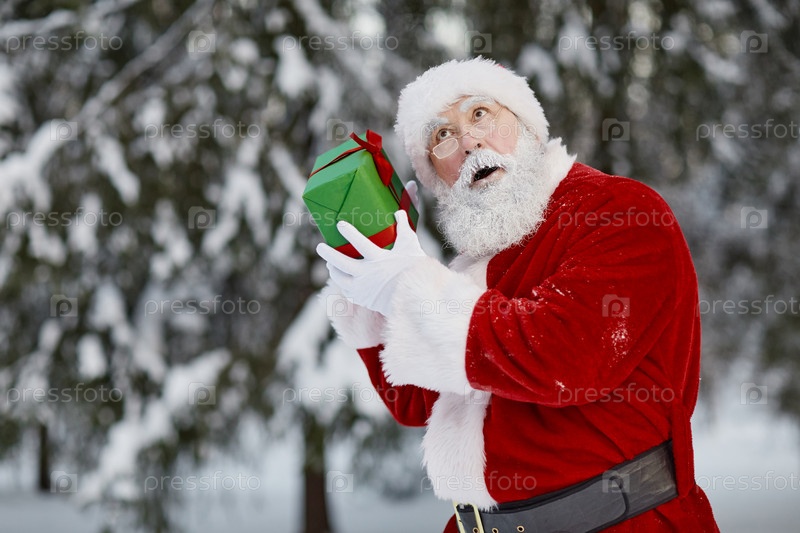 Санта Клаус встряхивает подарочную коробку