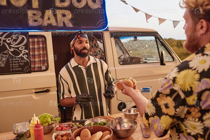 Мужчина покупает хот-доги на открытом воздухе