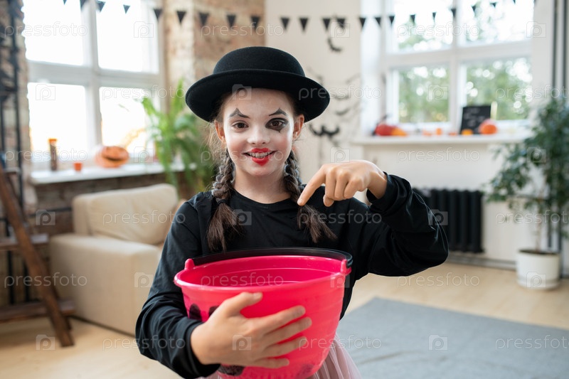 Счастливая девушка в черном костюме просит о сладостях на Хэллоуин