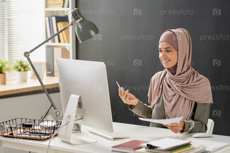 Счастливая молодая мусульманка, получающая онлайн-уроки