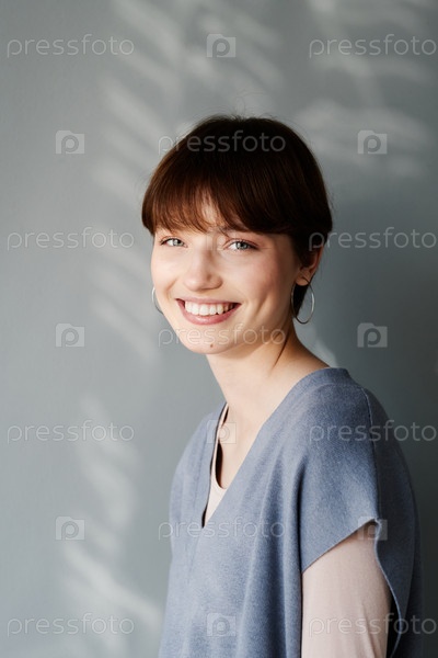 Счастливая привлекательная девушка с короткими волосами, одетая в хлопковый жилет и серьги на серой стене