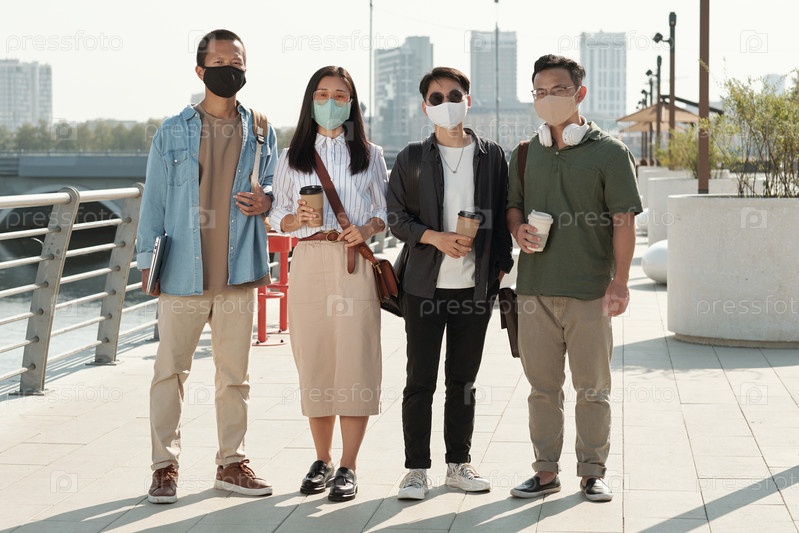 Очередь из четырех молодых китайских рабочих-белых воротничков с напитками
