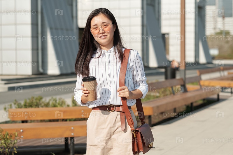 Молодая бизнесвумен с выпивкой переезжает вниз по современному парку