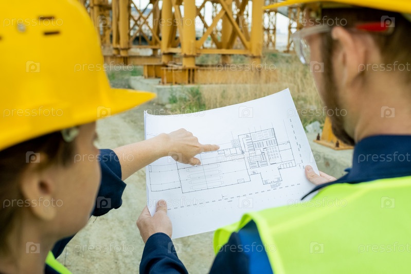Люди, работающие с чертежом на открытом воздухе