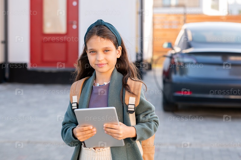 Милая школьница с планшетом стоит на зарядной станции