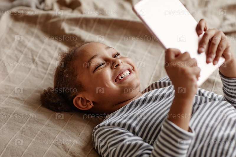 Улыбающаяся девочка использует планшет