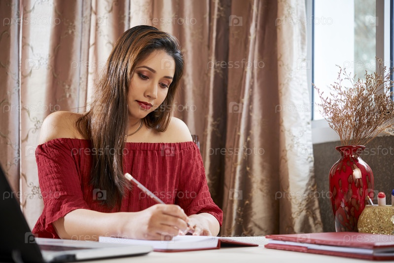 Молодая женщина, пишущая в журнале