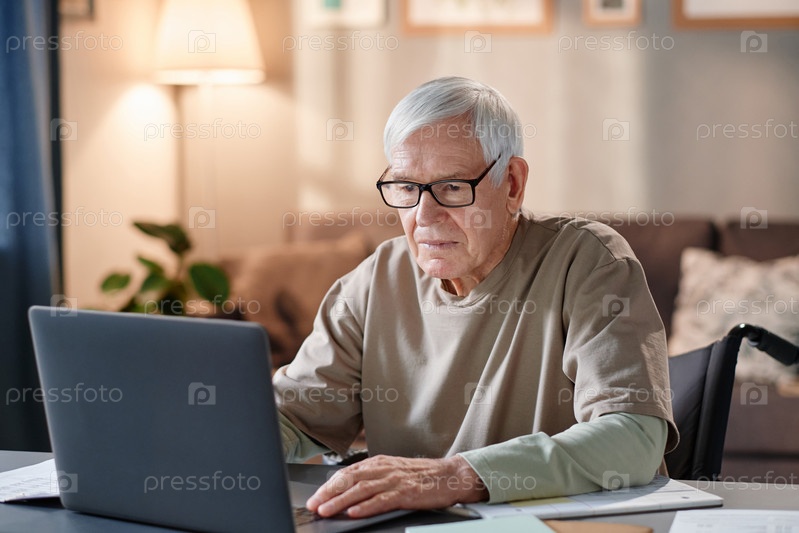 Старший мужчина работает в Интернете на ноутбуке