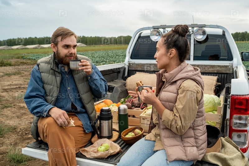 Фермеры пьют горячий чай на поле