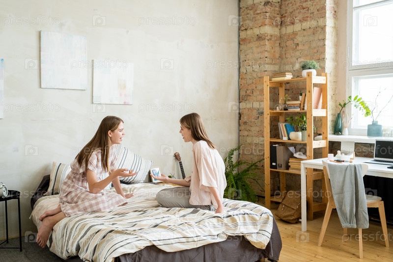 Веселые девочки-подростки обсуждают забавные вещи, отдыхая на кровати
