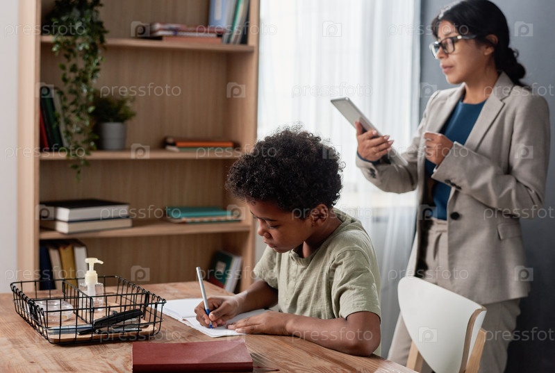 Концентрированный чернокожий мальчик с кудрявыми волосами выполняет задание на уроке, в то время как учитель использует планшет на заднем плане