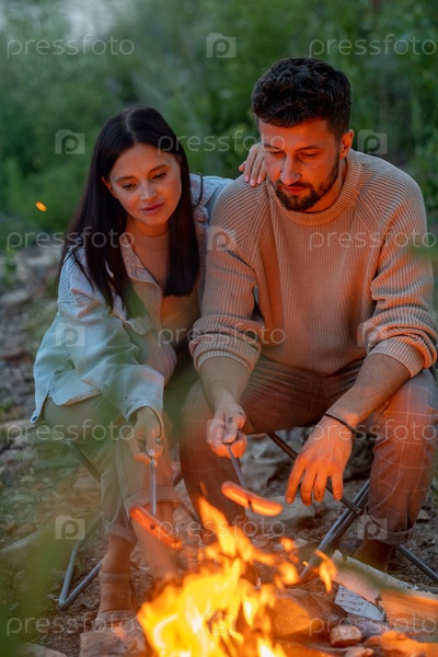 Молодая любящая пара жарят колбасы на огне