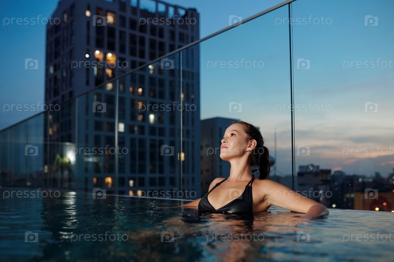 Пенсивная женщина отдыхает в бассейне