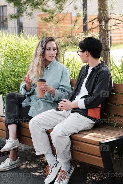 Две молодые женщины, сидящие на скамейке