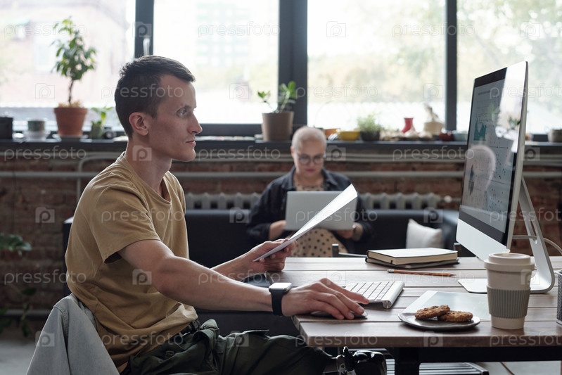 Сиде вид серьезного молодого бизнесмена, смотрящего на компьютерный экран
