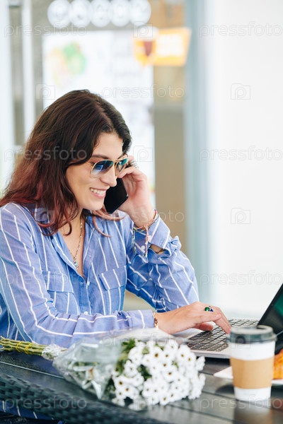 Улыбающаяся бизнесвуменка отвечает на телефонный звонок
