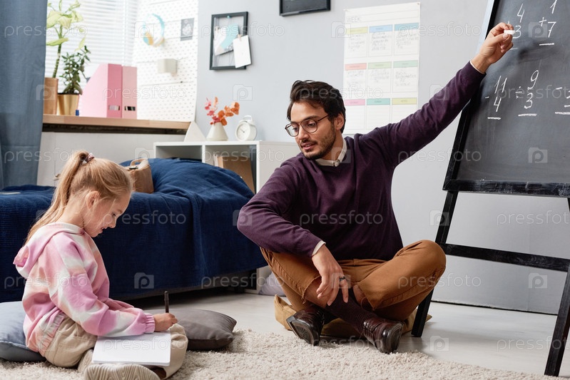 Молодой ближневосточный репетитор в очках смотрит на записки девочки и указывает на доску во время индивидуального урока