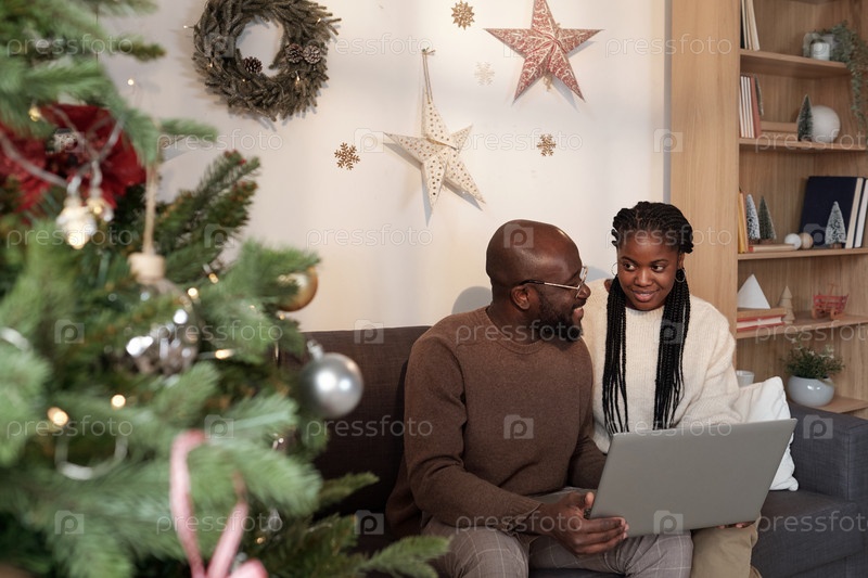 Счастливая молодая африканская пара ведет дискуссию перед ноутбуком