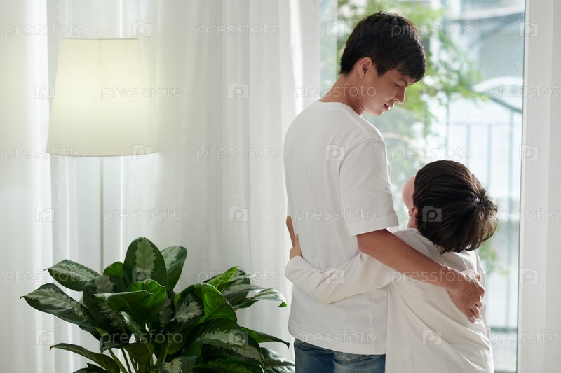 Отец и сын у окна дома