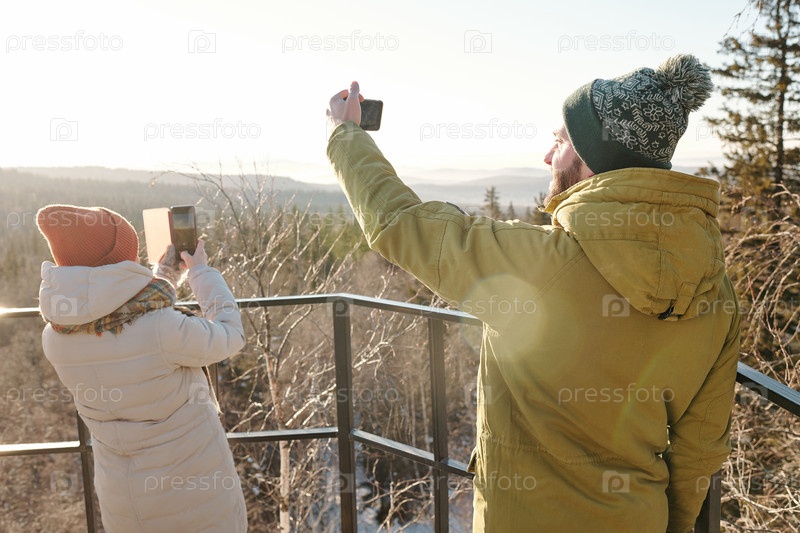 Молодая пара со смартфонами фотографирует природу в зимний день