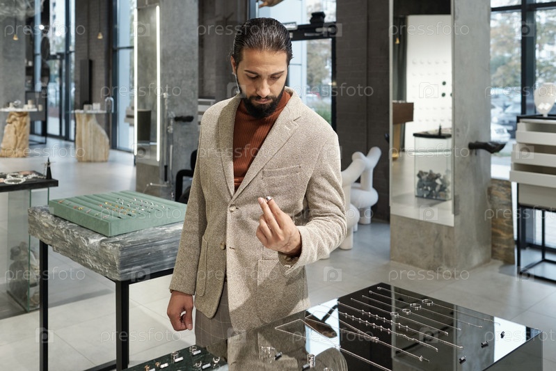 Молодой серьезный мужчина в формальной одежде выбирает кольцо в ювелирном магазине