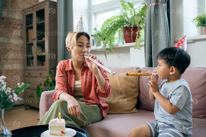 Мать и сын дуют в воздушные свистки на день рождения дома