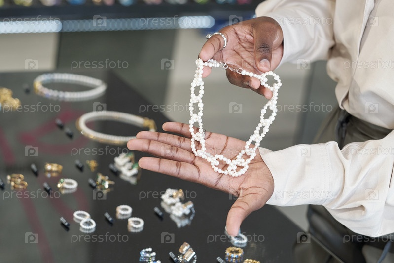 Руки африканского продавца, показывающего клиенту жемчужное ожерелье