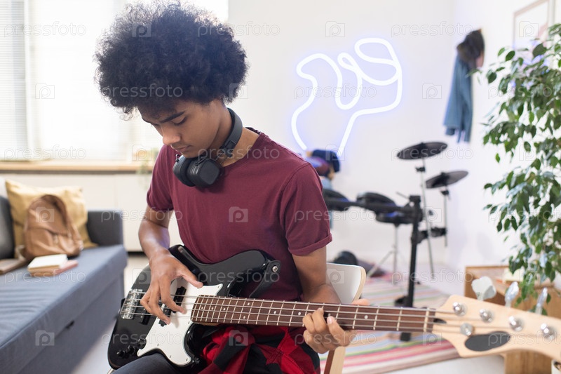 Молодой серьезный мужчина с наушниками вокруг шеи играет на гитаре