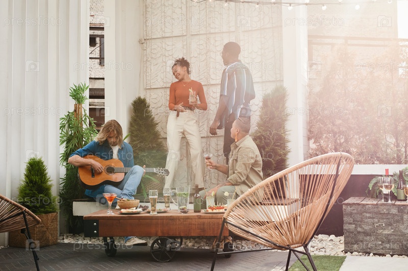 Молодые люди в солнечном свете на вечеринке на крыше