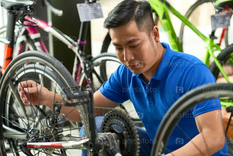 Человек, готовящий велосипед к продаже