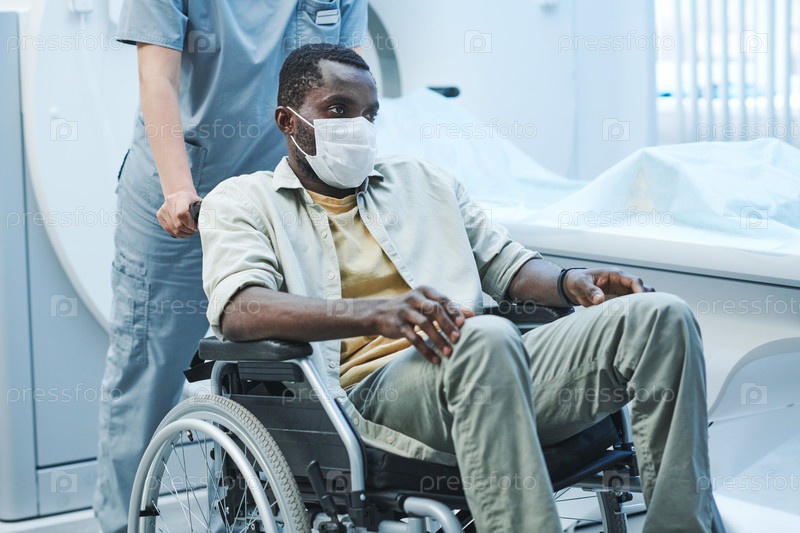 Чёрный пациент с коронавирусом в лицевой маске сидит на инвалидном кресле, который толкается медсестрой после МРТ