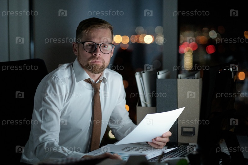 Молодой серьезный офисный работник в формальной одежде просматривает финансовые бумаги
