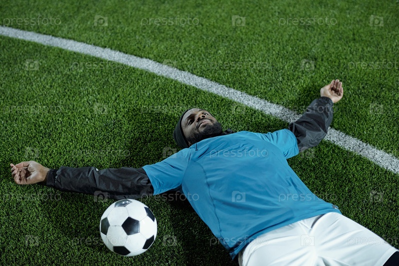 Молодой спокойный спортсмен в форме лежит на зеленой лужайке