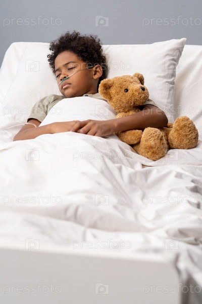 Больной ребенок лежит в больничной кровати с игрушкой