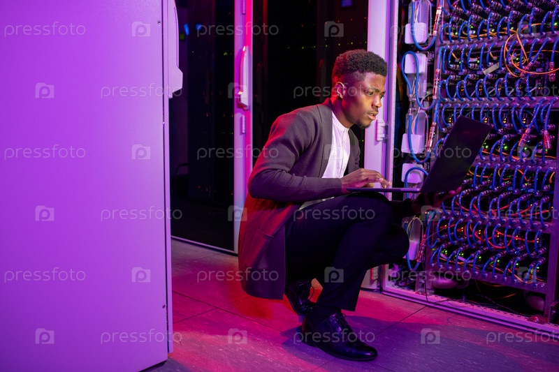 Инженер центра обработки данных проверяет сетевые настройки на ноутбуке