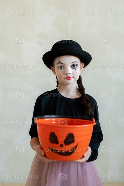 Девушка с макияжем на Хэллоуин просит сладостей, глядя на тебя