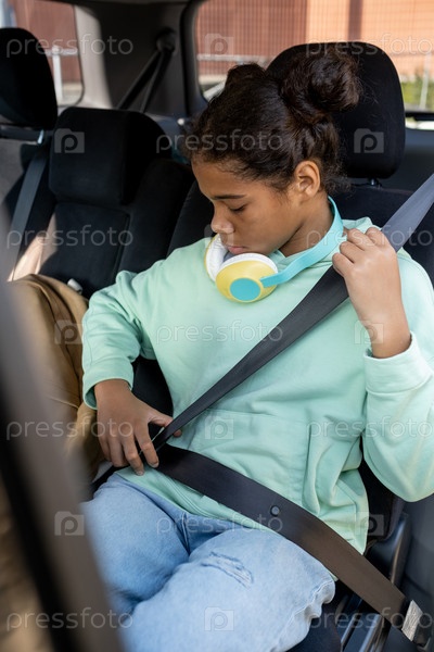 Милая школьница застегивает ремень безопасности, сидя в машине