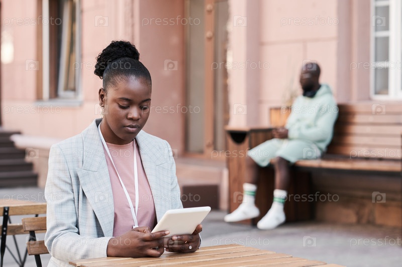 Чернокожая женщина использует планшет в городском кафе