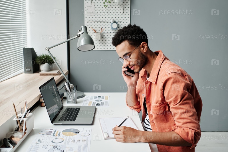 Серьезный молодой чернокожий менеджер в очках разговаривает по сотовому телефону и проверяет график в офисе