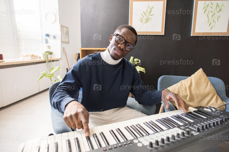 Молодой серьезный африканский мужчина смотрит на тебя, нажимая клавиатуру музыкальной клавиатуры