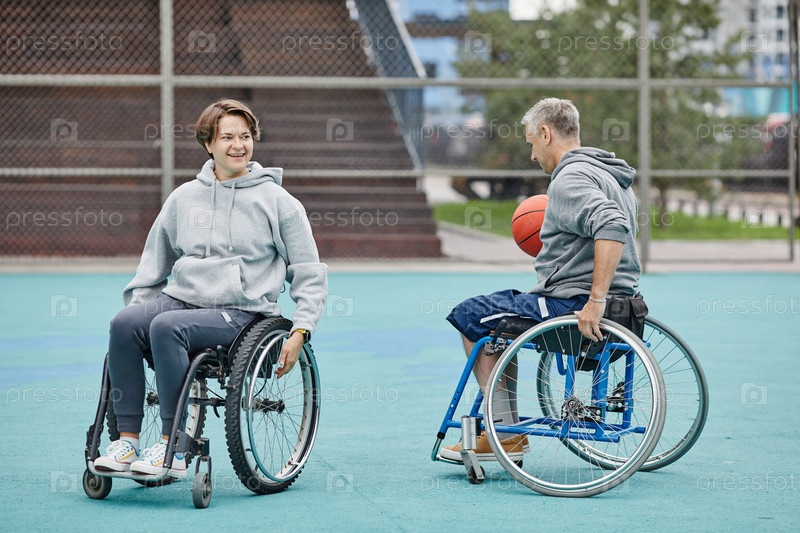 Пара в инвалидной коляске играет в баскетбол