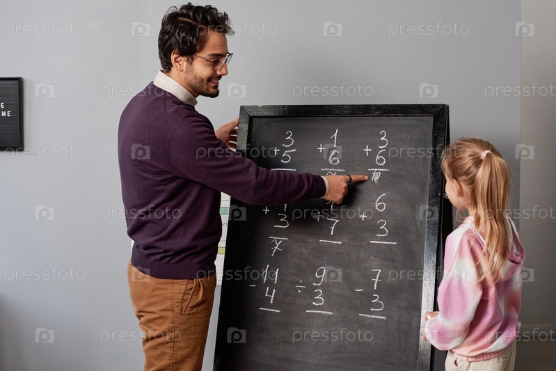 Улыбающийся преподаватель Ближнего Востока в очках указывает на пример на доске и объясняет ошибки девочке