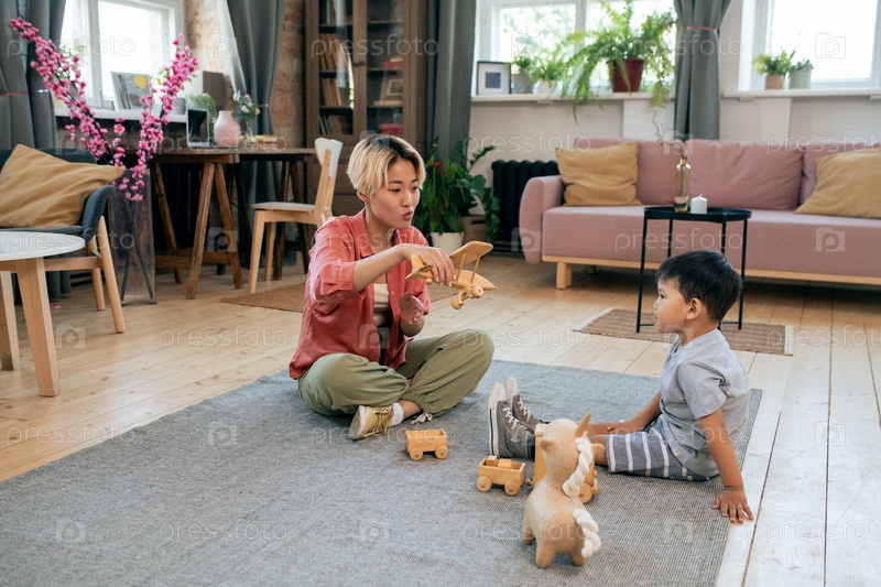Молодая азиатская женщина играет со своим милым маленьким сыном