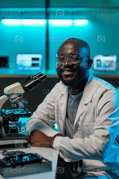Счастливый молодой мужской работник лаборатории, сидящий за столом с микроскопом