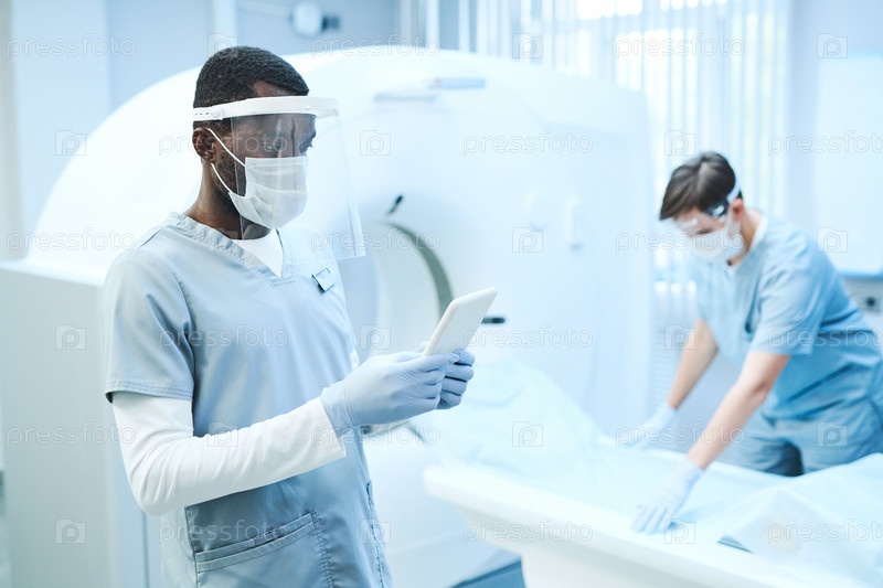 Молодой афроамериканский рентгенограф в маске и перчатках использует планшет в комнате МРТ, пока его коллега кладет лист на стол