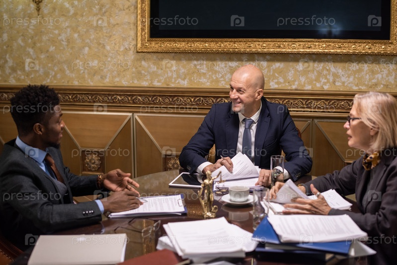 Группа межкультурных юристов, собравшихся за столом для обсуждения