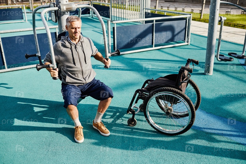 Мужчина с инвалидностью занимается спортом на свежем воздухе