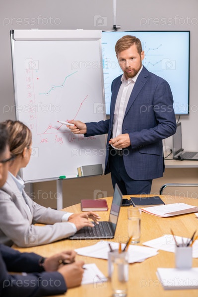 Молодой серьезный бизнесмен, указывающий на график на доске