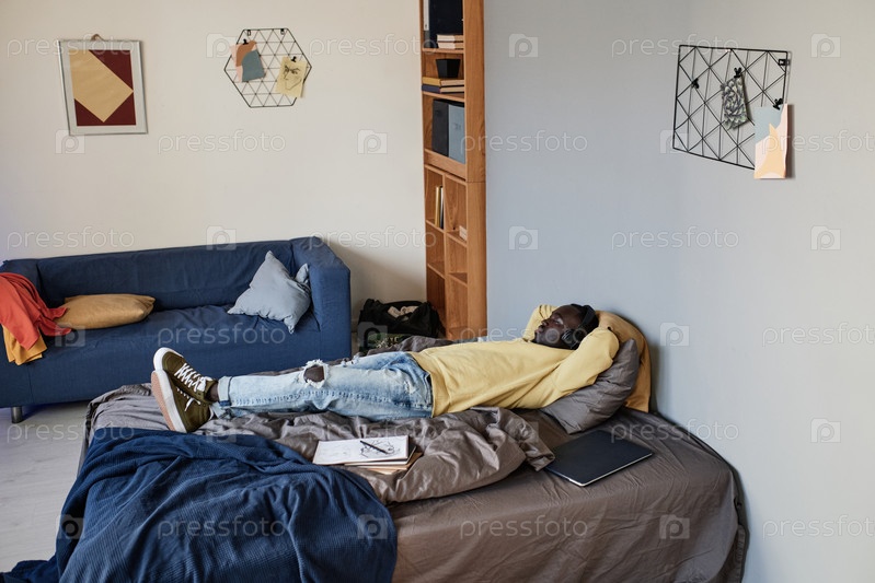Спокойный молодой чернокожий студент-мужчина в непринужденном наряде лежит на кровати в студенческой комнате и спит в беспроводных наушниках