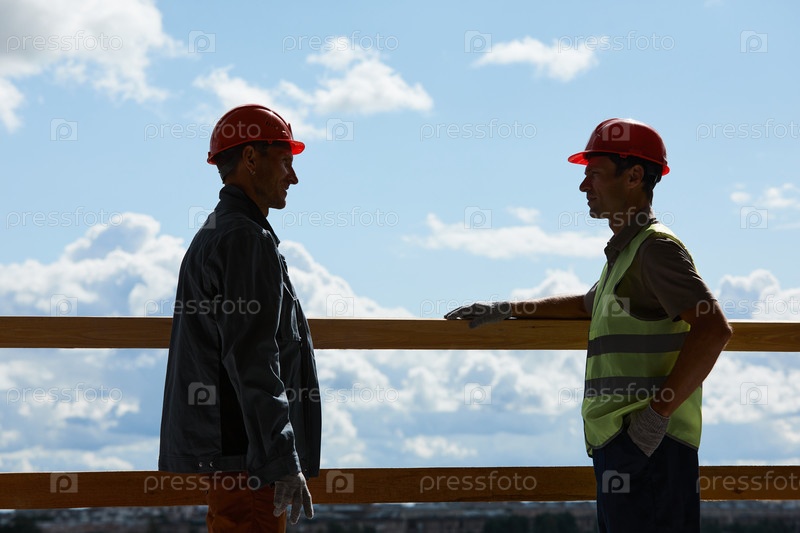 Два рабочих разговаривают на строительной площадке